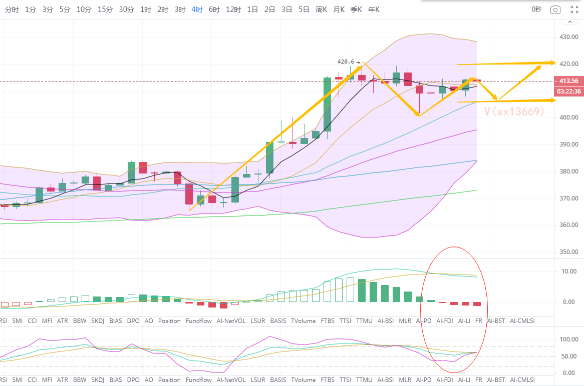 日线上前期承压于420阻力压制再次回落至410附近,回补行情暂时告一段落,昨日收取一根小阴线,目前币价有上探415一线的势头,晚间若破位可继续上看420。附图指标MACD双线在零轴上方金叉运行,长期看价格还会再次反弹。V(sx13669)