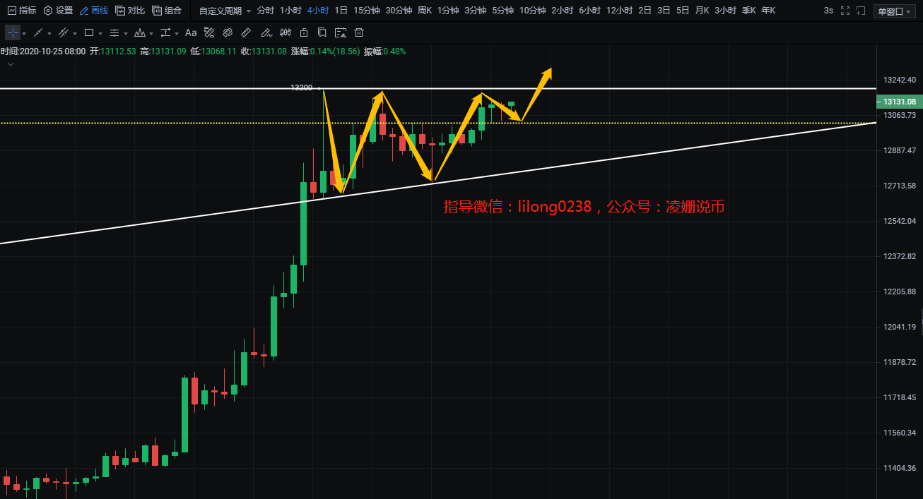 比特币四小时级别来看昨日行情企稳12900美金一线继续上攻,晚间最高上行至13166美金,目前行情于三角收敛形态运行,价格于上轨附近受阻,布林带呈缩口向上运行,价格于中轨上方运行。5日均线上穿10日均线运行,各均线呈多头排列。幅图指标MACD于0轴上方死叉运行,KDJ指标三线向上发散运行,RSI指标三线平缓运行,EMV指标下穿运行。凌姗个人认为短期受阻,比特币走势依旧强势,中继上涨形态,震荡代替回调,逢低做多为主。上方压力位13200,支撑位13020。