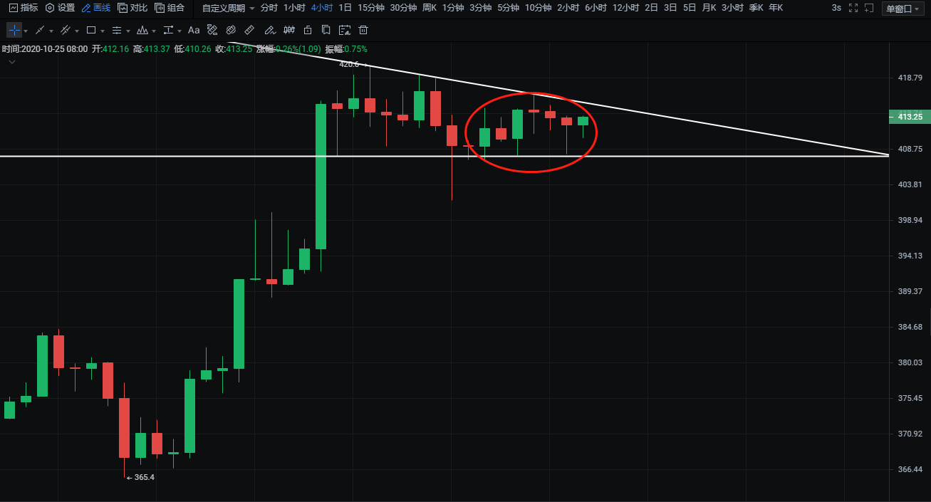 以太坊四小时级别来看价格昨日晚间于三角收敛上轨受阻开始回落,于下轨反弹,日内继续关注破位情况,布林带呈张口运行,各均线缠绕运行,短期还将震荡,继续关注趋势线压制效果。幅图指标MACD于0轴上方死叉运行,KDJ指标三线向上发散,RSI指标三线有向上拐头迹象。上方压力位420,下方支撑位407。操作上高空低多为主。