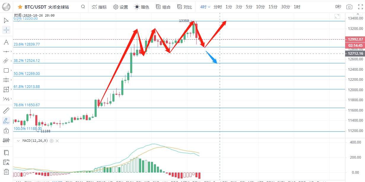 从四小时图看,布林带向上缩口,k线运行在布林带中轨附近,午间一波空头来袭将昨日的涨势尽数回收,5日均线扭头向下压制币价呈下行风险,附图中MACD双线死叉向下发散,红色动能柱持续放量,KDJ三线死叉向下,从指标上,目前暂时趋势偏向空头,晚间行情有下行的风险,晚间行情关注斐波那契0.236一线支撑是否有效,若支持有效,行情将反弹上攻,反之下行寻找斐波那契0.382一线。晚间操作上建议企稳13000一线后在多单入场,下破12800一线空单入场。