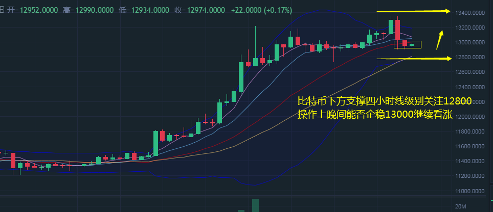 策略一:比特币13000企稳做多,止损100个点,目标13200-13300涨破看13500。