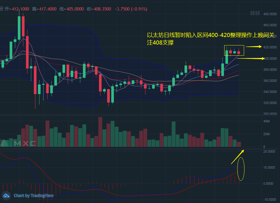 策略一:以太坊408企稳做多,止损4个点,目标414-416.