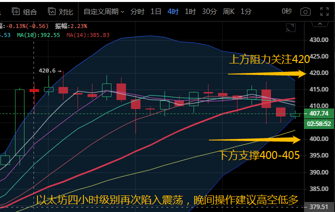 以太坊四小时级别来看,布林带缩口向前运行,币价跌破中轨支撑后运行在中下轨区域。附图中MACD快慢线向下拐头运行在零轴上方,红色动能柱放量。四小时级别来看,空头趋势逐步加强。午间跳水并未跌破下方400附近支撑,晚间重点关注400-420区间,操作建议区间内高空低多即可。