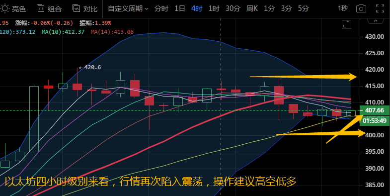 以太坊四小时级别来看,布林带张口向下运行,币价稳定在中下轨区域运行,各均线微微向下拐头运行。附图中MACD快慢线向下运行在零轴上方,红色动能柱放量。KDJ三线聚合向前运行。四小时级别来看,行情波动暂时并未破位,晚间行情走势多以震荡运行为主。关注区间400-415,操作建议高空低多。