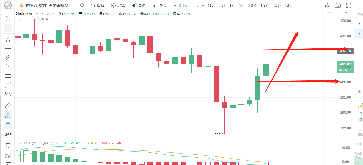 以太坊行情分析:以太坊联动比特币又重新回到400一线上方,打破前几日的跟跌不跟涨的局面。从四小时图看,布林带张口运行,k线在5日均线的支撑下一路上行,目前已经突破布林带中轨压制,晚间关注以太坊是否能够企稳布林带中轨一线,若能企稳,行情将有望回到410一线。附图中MACD双线死叉在零轴附近,红色动能柱逐渐缩量。上方压力位410,下方支撑位400.综合来看,晚间操作上等币价企稳405一线后在多单入场,若行情承压回落下破400一线就要考虑空单入场了。