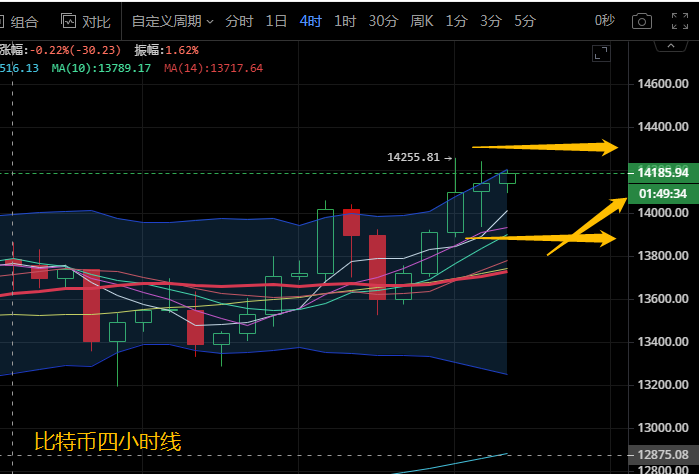 比特币四小时级别来看,布林带张口向前运行,行情不断向上突破运行在上轨附近,各均线拐头向上运行。附图中MACD快慢线向上勾头运行,绿色动能柱放量,KDJ三线向上发散。四小时级别行情多头持续上探。日内关注上方阻力14300-14500,下方支撑13900。日内操作注意短期小幅度回调,汐柔建议操作低多为主,高空为辅即可。