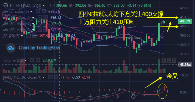 四小时线上分析以太坊日内企稳400支撑拉伸,四小时线维持水平线400上方于布林带中轨震荡上行,布林带缩口上扬,MACD在零轴上方金叉运行,红色动能柱,指标弱势加强。小时线日内上分析K线金叉于五日均线和十日均线于405震荡上扬,布林带缩口上扬。操作上以太坊日内操作上下方关注区间405-400支撑,上方阻力关注410压制突破继续看涨上行至420.