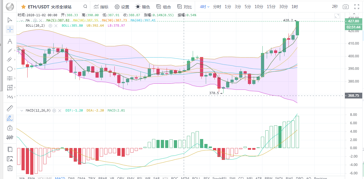 以太坊行情分析:以太坊昨日企稳400一线后也开始补涨,目前已至高点428,以太坊的涨势相对于比特币来说就有点小巫见大巫了,但以太坊2.0即将发布,以太坊补涨是大概率的事了,后续有望回到450一线。从四小时图看,布林带张口向上,K线运行在布林带中上轨,5日均线勾头向上在下方形成短暂支撑,附图中MACD双线金叉向上发散运行,绿色动能柱持续放量。KDJ三线金叉运行。以太坊的多头逐渐回暖,预计日内会继续向上试探。