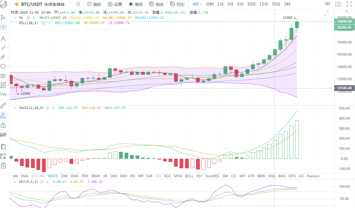 比特币行情分析:比特币自前天开始,多头逐渐发力,行情持续走高,不断刷新新高,目前已经来到15985一线,距离16000只有一步之遥。昨日一天涨幅超过1600点,这还是相当恐怖的,这无疑是给多军打了一副兴奋剂。从四小时图看,比特币已经十连阳,布林带张口运行,K线运行在布林带上轨之上,但随着行情的不断上拉,上方给到的压力也越来越重,上涨动能也开始逐渐减弱,目前的行情虽偏向多头,但不可盲目追高,等待行情回踩确认支撑后在入场也不迟。附图MACD双线金叉向上运行,绿色动能柱持续放量,KDJ三线开始平行运行。