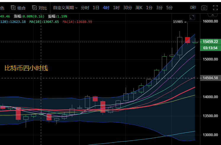 比特币今日行情截止到目前最高点上冲至15985,从四小时级别来看,币价向上插针突破上轨压制后再次回落,下探至低点15415附近。四小时级别来看,币价稳定在MA5上方运行,各均线呈多头排列,附图中MACD双线向上勾头运行,多头动能柱持续放量。附图中KDJ三线聚合后向前走平。四小时级别多头依旧占据优势,关注下方支撑15400,上方关注阻力16000,破位继续看涨。四小时级别看,日内操作思路回踩做多为主,谨防插针添加微信pyt3069。