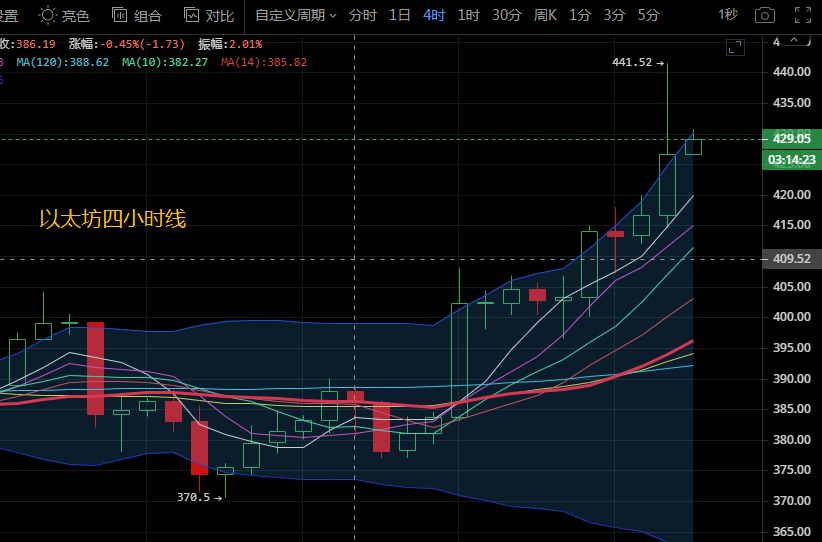 以太坊今日的走势相对于前几日有些气色,由于利好消息不断,由弱势状态转变位强势,400上方的空间被打开。今日早间行情上行至最高点441.5附近后小幅回落添加微信pyt3069。