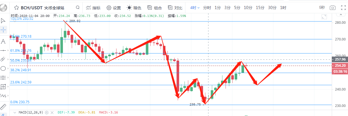 BCH行情分析:从四小时图看,布林带微微张口,K线运行在布林带上轨附近,5日均线上穿10日均线在下方形成支撑,BCH在下跌至230.75一线获得支撑开始有所反弹,多头有所回暖,行情一路上涨,目前行情承压回落。附图中MACD双线金叉向上运行,绿色动能柱持续放量。上方压力位262,下方支撑位243.操作上回踩做多。