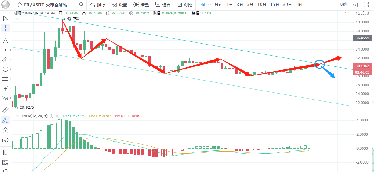FIL行情分析:从四小时图看,布林带微微张口,K线运行在布林带上轨之上,5日均线上穿10日均线金叉向上,附图中MACD金叉向上发散,绿色动能柱持续放量。从整个盘面上,FIL目前仍处于下行通道中,但行情有上涨需求,若能冲出下降通道,达到31美金以上,行情还是有望继续上涨,反之行情将重回下降通道内。