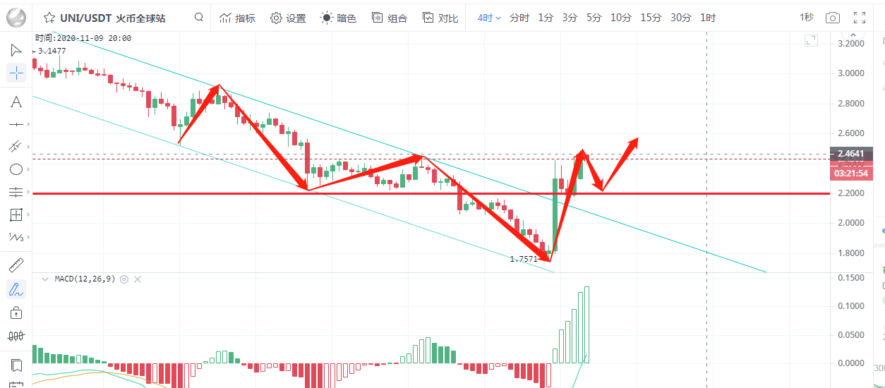 UNI行情分析:从四小时图看,布林带张口运行,K线运行在布林带上轨附近,行情目前已经走出了下降通道,附图中MACD双线金叉向上运行,绿色动能柱持续加强。KDJ三线金叉向上运行。上方压力位2.6,下方支撑位2.2.综合来看,行情由空头转向多头。操作上等回踩后再度入场。