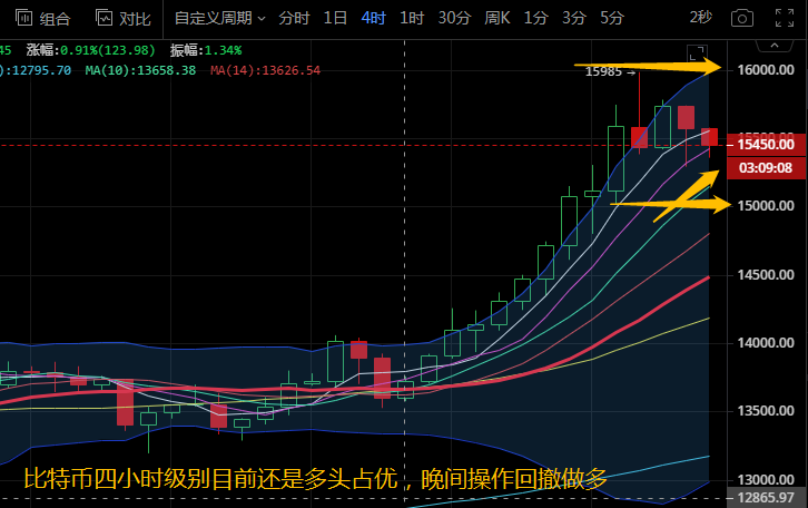 比特币四小时级别来看,布林带开口向前运行,币价跌破下方MA5支撑运行在MA10上方,各均线上攻姿态逐步放缓,附图中MACD双线上行力度减弱运行,绿色动能柱持续开始缩量。综合来看,四小时级别多头情绪依旧浓重,盘面多头强势,但也要注意上方16000的压制目前还是较为明显的,汐柔建议晚间重点关注下方15000-15200支撑,上方阻力看到15900-16000,破位继续看涨,操作建议回撤做多为主,顺势而为。