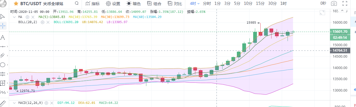 比特币行情分析:自昨日拉升上涨冲击16000大关受阻后,行情进入了一个暴力拉升后的修复期,比特币上涨攻势逐渐减缓,预计白盘将进入震荡盘整局面。从四小图看,布林带张口向上,5日均线开始走平,行情波幅逐渐减小。附图中MACD双线金叉在零轴上方运行,绿色动能柱有所缩量,KDJ三线平缓运行。综合来看,日内行情将延续此局面。操做上高空低多即可。上方压力位15750,下方支撑位15300.
