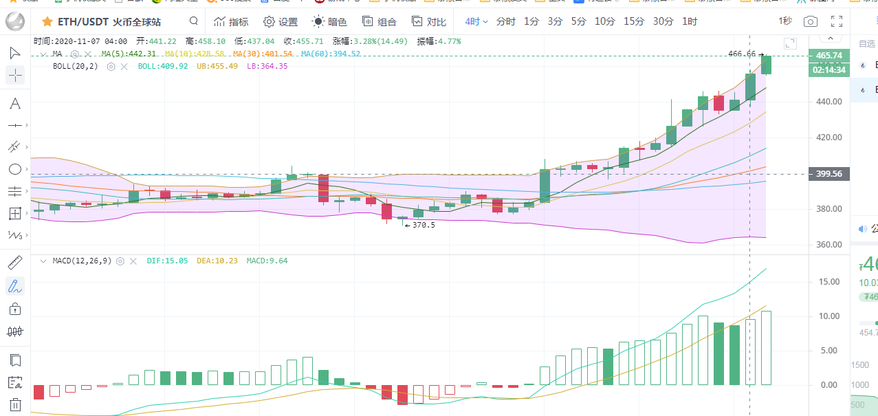 以太坊行情分析:以太坊自早间开始拉升上涨开启showtime模式,最高触及466.66承压回落,但个人认为以太坊的涨势不仅仅止步于此,有望继续向上试探冲击前期高点488一线。从四小时图,布林带张口向上运行,K线运行在布林带上轨一线附近,各均线多头排列,附图MACD双线金叉在零轴上方运行,绿色动能柱持续放量。KDJ三线金叉向上发散。综合来看,以太坊多头趋势骤显,有望继续向上冲击。