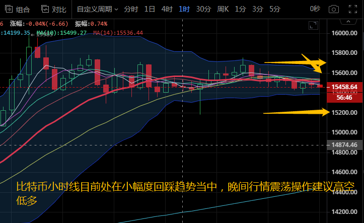 比特币小时线级别来看,布林带平缓向前运行,行情从早间的上轨附近回踩至中下轨区域运行。附图中MACD快慢线向下拐头运行,红色动能柱保持放量,KDJ三线向前走平运行。小时线级别来看,行情处在小幅度回踩趋势当中,晚间操作关注区间15180支撑,上方阻力关注15750压制,晚间操作建议高空低多即可。