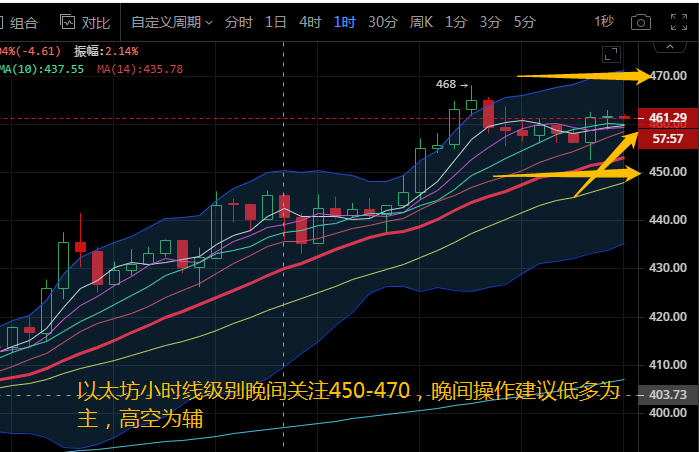 以太坊今日行情震荡为主,早间上行至最高点468附近后,日内行情持续震荡下行,多次试探460下方,最低点至452.58反弹,目前稳定在460附近运行。