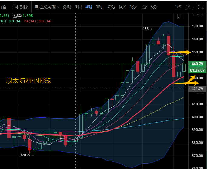 以太坊四小时级别来看,布林带张口向前运行,行情一根大阴线从上轨附近回踩至中轨附近运行,币价暂时稳定在中轨上方运行。MA5下穿MA10形成死叉,附图中MACD双线死叉向下运行,空头动能柱开始放量。四小时级别多多头趋势减弱,行情触底反弹,目前处在拉升趋势当中,日内操作建议高空低多即可。关注下方支撑425,上方阻力关注445-450.