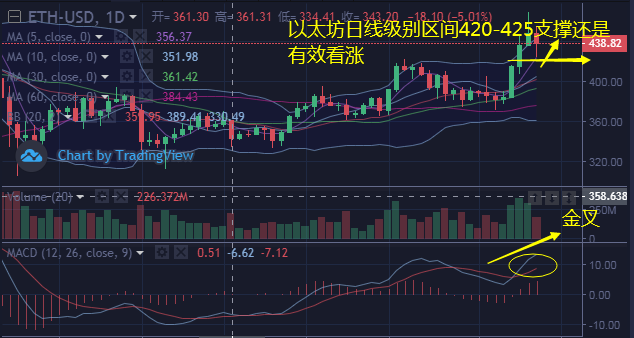 日线上在九月份行情冲高至500关口受阻回落后日线级别以太坊维持300-450区间盘整运行,日线上在前三个交易日连续震荡上行,昨天以太坊最高冲高至469美元后行情受阻回落下行,昨天晚间行情反转下跌至低点424低点,日线下方获得五日均线425支撑,K线运行在布林带中轨,布林带微微张口下行趋势。附图MACD在零轴上方金叉运行,红色动能柱,指标弱势加强。