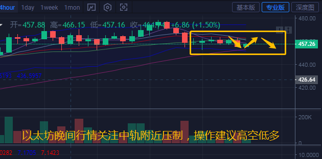 以太坊四小时图上看,币价在中轨下方运行,整体的走势相对较为平稳,行情上行并未打破上方压制区域。附图中MACD快慢线向下运行,空头动能柱放量。四小时级别来看,行情还是空头趋势为主,汐柔预计短期还会延续震荡,操作也是高空低多即可。日内建议关注上方465-470,下方关注支撑455-450.