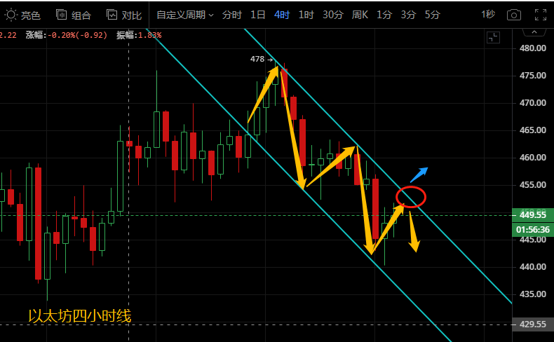 以太坊昨日跟随比特币震荡下行走势,四小时级别来看,今日凌晨行情急剧回踩至440后反弹,目前稳定在448附近。四小时级别来看,布林带张口向前运行,币价跌破下轨支撑后反弹,各均线呈空头排列,MACD快慢线向下运行在零轴附近,红色能量柱逐渐放量,KDJ三线即将粘合交叉.四小时级别空头情绪依旧存在,操作建议高空为主,低多为辅。关注上方460的压力位置,下方440的支撑。
