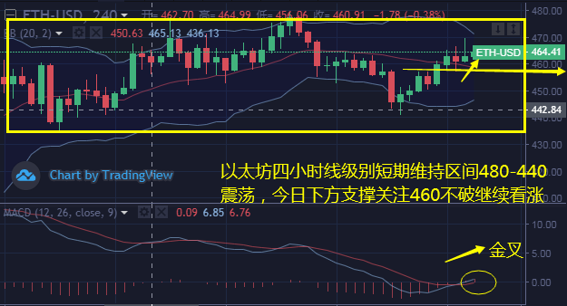 以太坊日线上大级别分析今年始终没有涨破上方整数关口500美元压制,日线上近期受到比特币多头提振依旧上方没有能够涨破第一阻力位480美元压制,以太坊多头攀岩没有比特币上涨动力强,日线上分析昨天再次企稳450支撑震荡上行,日线上收取一根下影线稍长的倒垂线,K线运行在布林带中轨,布林带缩口上方。附图MACD在零轴上方金叉运行,红色动能柱,指标弱势加强。日线上肯定今日久居460支撑不破,日线上韩币钰个人依旧今日看涨至470。