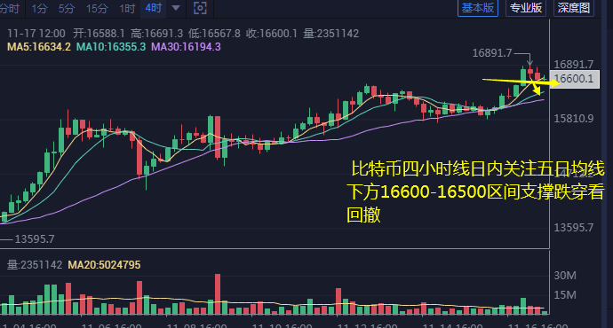 策略二:比特币跌破16500顺势空单,止损100个点,目标16300-16200.