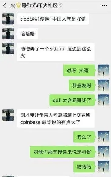 甚至还说国人就是好骗,随便弄了个SIDC币,没想到搞得这么火。甚至还吹牛说,自己的币要上coinbase,散户在他们眼里就是傻逼。
