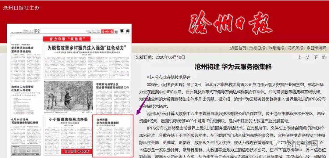 沧州华为云计算大数据中心引入IPFS