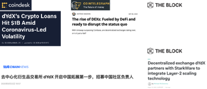 当前,dYdX在海外区块链圈子,尤其是DEX和DeFi圈子都有很高的讨论热度。dYdX是Conflux Network的Open DeFi 联盟的首批成员。包括Coindesk、Cointelegraph、THE BLOCK在内的一线媒体都对其进行了报道。