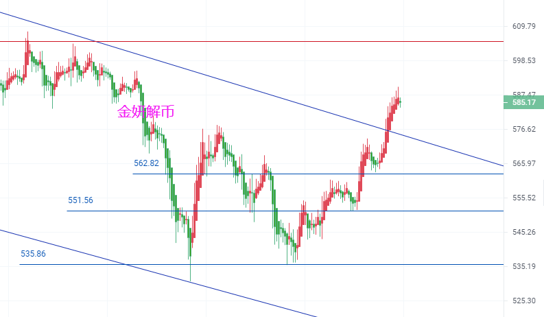 2、回调不破571继续做多,571-575-580分批多,止损565之下,目标586-590-595,破位上看600-608