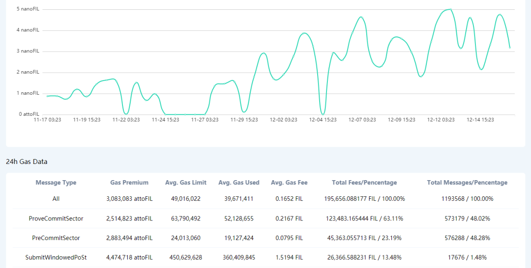在Filecoin区块链浏览器中,我们点击并进入gas那一栏目,可以看得到gas基础费率走势图,24小时的gas数据其实就是gas费用消耗明细的展示。