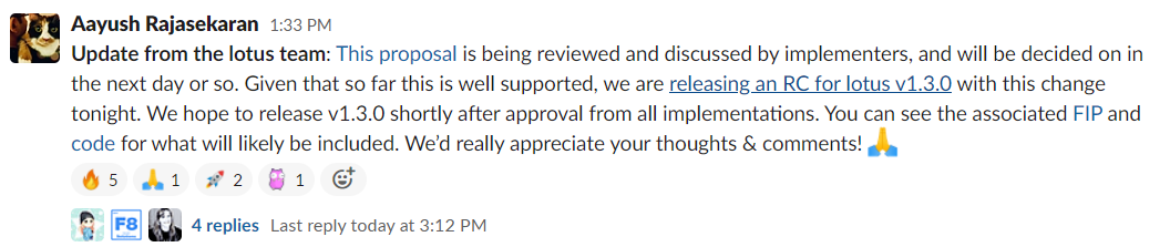 北京时间12月16日 12:10,Filecoin官方人员Aayush Rajasekaran 在slack频道发布最新公告称,将在今晚(项目方的今晚是我们的明天凌晨)发布Lotus v1.3.0 测试版本,并希望在所有实现批准之后不久发布v1.3.0正式版本。