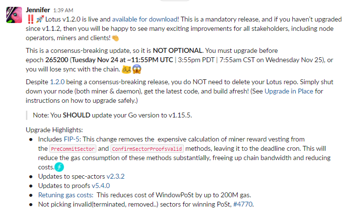 其实,官方也曾设立了一个FIP-5提案,该提案致力于从PreCommitSector和ConfirmSectorProofsValid中删除昂贵的矿工奖励归属计算,从而有效减少gas费用的消耗,释放链带宽并降低矿工成本。事实上,11月25日,Filecoin网络升级至Lotusv1.2.0版本后,gas费也的确有效降低了,但是好景不长,大概在五天后,gas费又开始飙升并且创造新高。