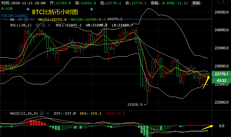 日线上看比特币连续收阴,多头尽显疲态,有上测的势头,但屡次承压。下方亦是相对的,多次下探,均止跌反弹,高位之中的行情偏向调整,就看行情往哪一个方向走。日线技术图上看BOLL呈开口状态,随着行情的调整修复,上行空间逐渐向上延伸。目前币价运行于MA5/MA10两大均线之中,上方MA5均线于23200美元一带形成压制,下方MA10于21900美元一带形成支撑,短期的话就看该两大支阻力情况。若是向上突破的话我们就顺势跟进多,若是下破的话我们继续看回调,中期支撑在18779.6美元一带。短周期各大技术指标缓和向下,附图MACD动能缩量,预计大饼将继续维持高位调整姿态。对于今晚的行情谈老师继续看好调整,短线小时线以及四小时线行情走的比较平稳,操作上保持主多辅空思路进行。若对技术行情以及消息面解读把握不定或者持有套单的朋友皆可与谈老师进行探讨。订阅公众号;币圈散户联盟。