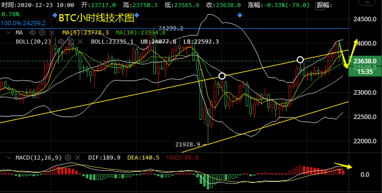 四小时上看大饼在一波插针向下之后出现止跌,暗示下方支撑强势,大饼于BOLL下行通道之中一路上行趋于上行通道之中,BOLL呈持平状态,短线仍是运行于12月20日的高低点之中,MA5/MA10持续金叉支撑币价上行,短线重点关注BOLL上轨于24200美元一带阻力,下方关注BOLL中轨于23400美元一带支撑情况。短周期各大技术指标缓和,附图MACD动能缩量,预计大饼维持震荡上行走势。综上所述:早盘大饼冲高回落陷入调整之中,整体的趋势依旧偏多,几度强调短线的回调是为了后期的蓄势拉涨。上面说了周期不确定,其次还有一个时间节点,就是本周的平安夜和圣诞节,谨防出现变盘的节奏,虽然看涨,但这个节点不建议去盲目追多,落袋为安即可。若对技术行情以及消息面解读把握不定或者持有套单的朋友皆可与谈老师进行探讨。