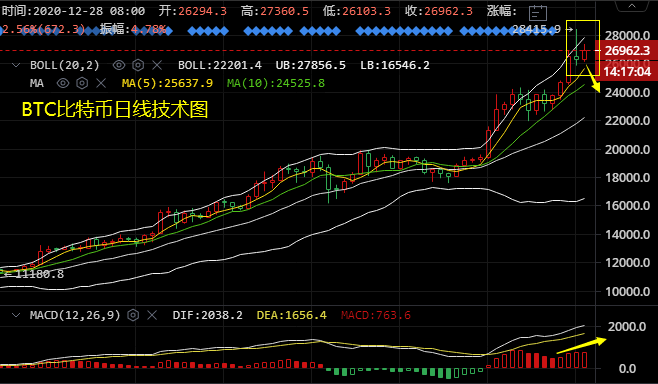 大饼,一根倒锤子线之后进入高位调整趋势之中。大饼,在隔日触及高位28415.9美元一线后,币价转而回落,短线接连跳水失守27000/26000美元关口,下方回落至25880美元一带后止跌反弹,而今日整体的行情维持在27000美元关口上下盘整。