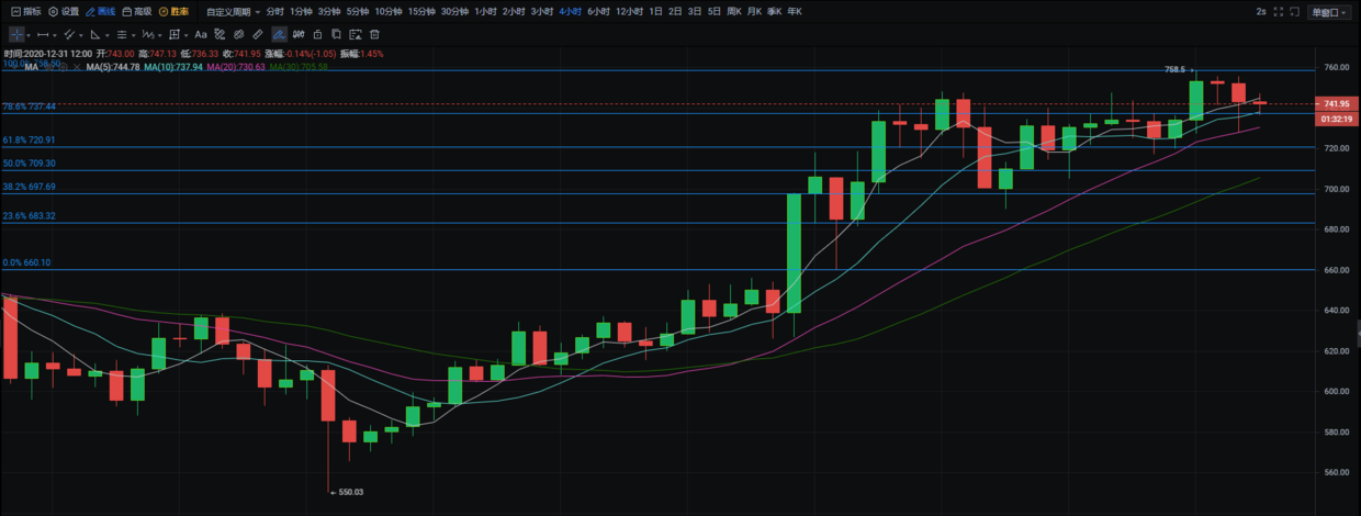 这几天以太坊的行情走势基本处于一个对做合约朋友的一种对峙!为什么这么说?很明显了,庄家高位控盘导致的上下插针!让市场减少对他后续的不利!也呈现出来了一种暴风雨来临前的宁静状态,以太新高突破740关口之后,行情进行了三天的修复状态。就在大部分散户对市场保持一种无戒心的时候,今日凌晨又一次拉升到758.5再一次新高!接着也快速进行了回调整理,最低触及728附近又开始反弹;目前行情运行在742附近;所以大家在目前的这种行情下做合约千万不能掉以轻心,必须得时刻保持警惕,每一次的进场保持敬畏之心!