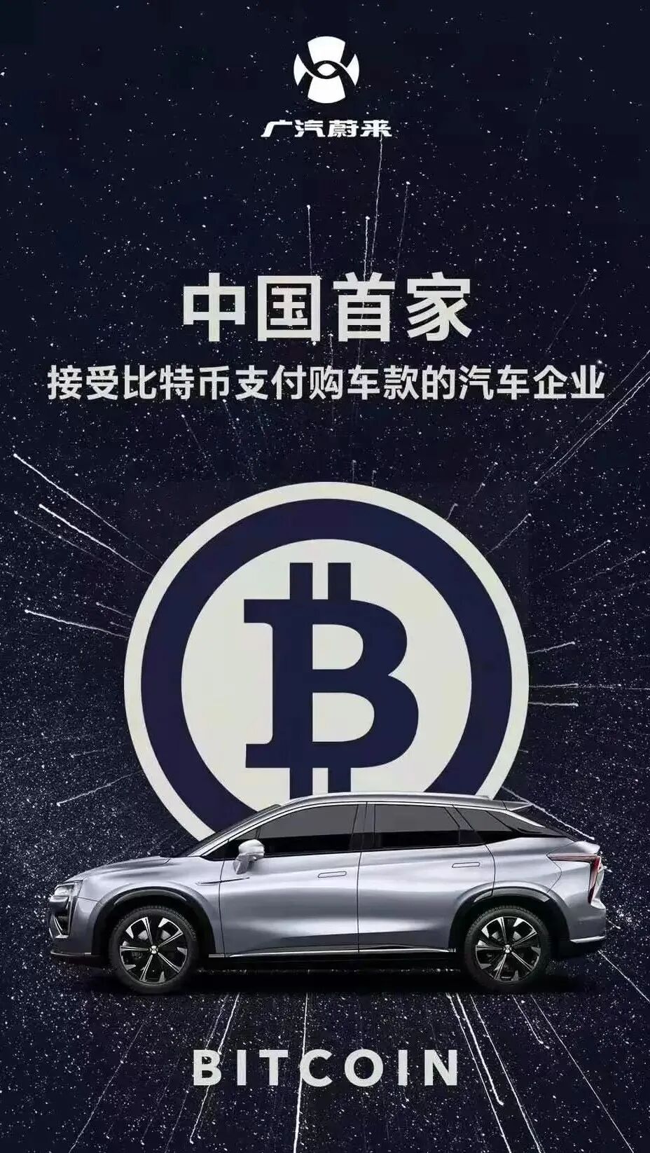 早上10点,广汽蔚来在官方微博宣布,接受比特币支付购车款,成为国内首个支持比特币的车企,并配以大幅海报宣传。