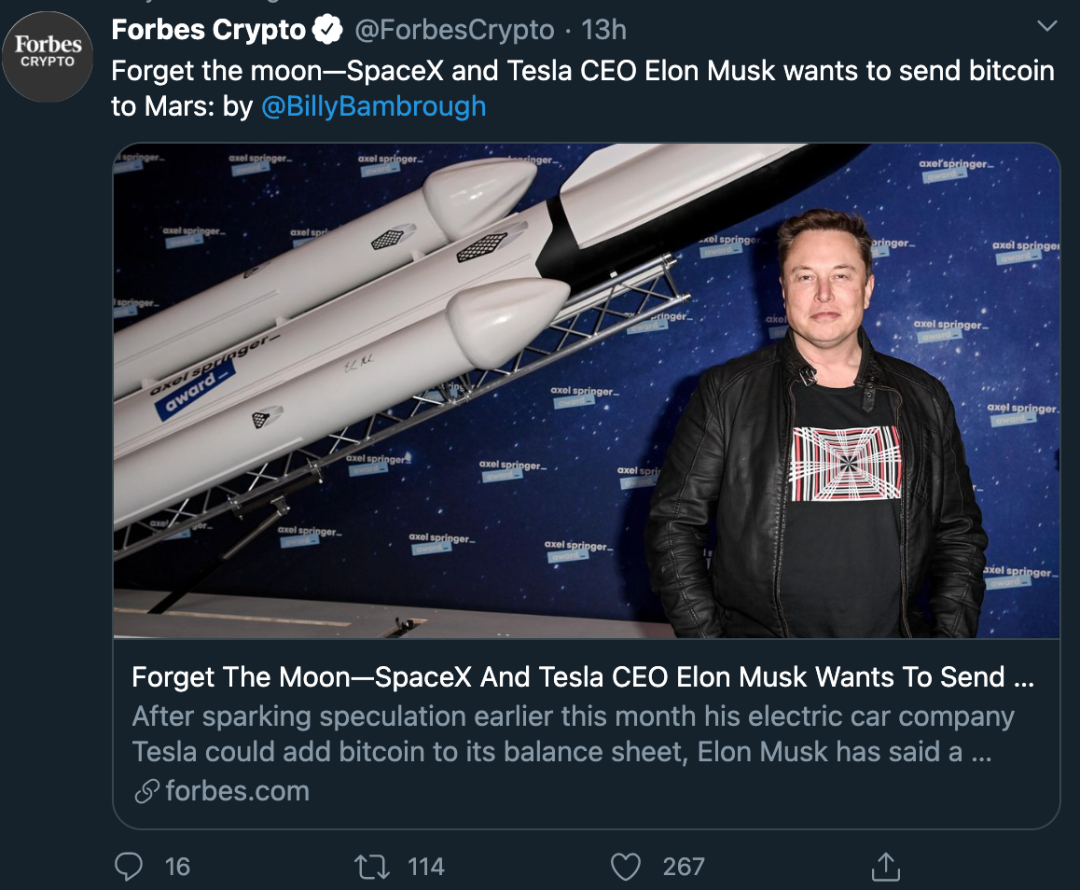 也是在2021年的最后一天,地球的另一边,那个被称为“硅谷钢铁侠”的、这颗星球上最不可思议的男人——埃隆·马斯克(Elon Musk),对媒体发表了一个疯狂的想法——准备带BTC等加密货币去火星。