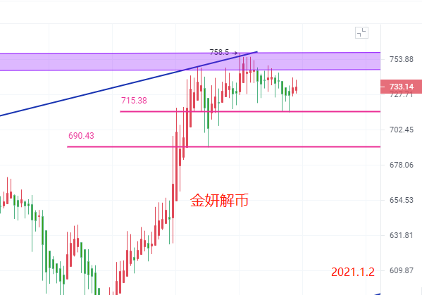 以太坊价格不断向上攀升多次冲高明显受到上方压力阻碍,近日也是开始缓慢走弱趋势,多头情绪较为萎靡,短期不适合盲目追涨,从目前的四小时图看,攻击线偏向下行,震荡区间有下滑走向,但基本还在金妍昨天给的震荡区间715-760内,昨日午夜和今日早盘两次试探下方715支撑,都只是虚破,那么今日欧美盘若价格再次试探破位下方715的话,金妍认为今日姨太则要空头为主了,今日操作上还是先维持区间来回震荡操作,支撑位今日关注715、和705-700,上方压制继续关注745、750,高空低多的震荡手法操作即可。