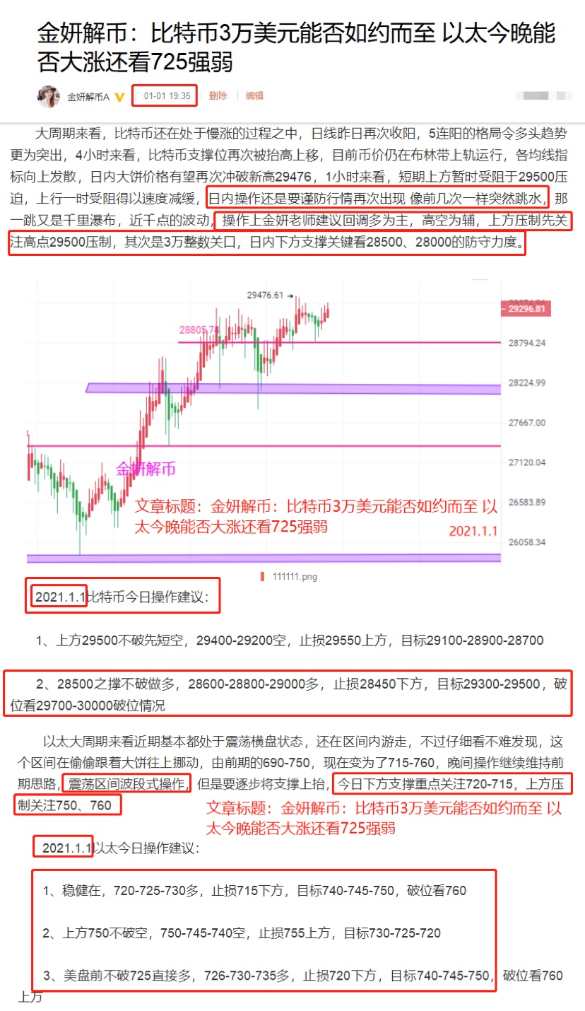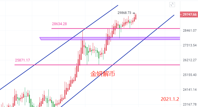 比特币在昨天元旦之际再次刷新高,最高触及29619一线,这个涨幅在金妍的预料之中,而后到凌晨后比特币开始频繁上演跳水,这个在昨夜的分析里金妍就提前给大家打过预防针了:要谨防行情再次跳水,所以多单大家真的不能贪心,赚钱就要出。果不其然行情一如既往的狗血再次插针,不知大家昨晚可否有把握好?盘面走势来看,日线再次收阳,今日整体多头趋势还在延续,目前大饼价格在29710一带运行,四小时图上看价格在不断试探布林带上轨阻力,区间在逐渐往上移,多头情绪比较浓重,今日大饼很有可能突破3万大关,但同时还是要预防行情再次冲高回落直接跳水,日内首次试探30000关口不破的话,可在29900下方轻仓布局个空单。今日后市操作上金妍建议还是以回落低多为主,高空为辅,上方压制关注30000整数关口的破位情况,下方支撑关注29300、29000