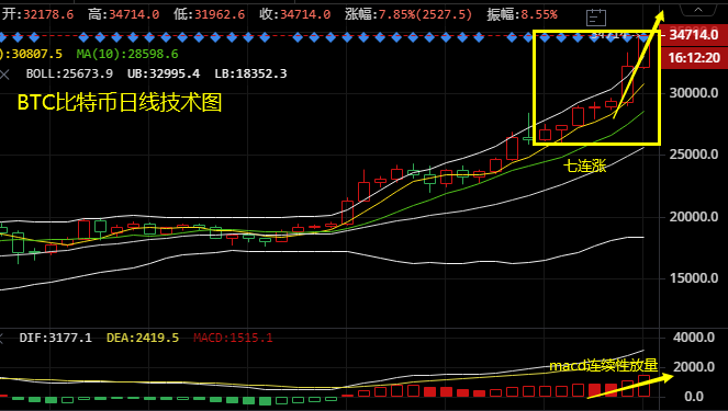 比特币,日线七连涨,每日收线的高点就是次日的低点,币价沿着BOLL上轨上行并突破该位置压制,上方没有明显阻力,多头不言顶,短周期各大技术指标向上运行,附图MACD动能连续性放量,预计多头将继续向上攀升。短线上看比特币在一波拉涨跳水之后,紧接着迎来了第二波上涨趋势,上涨的势头更加强烈,在这样的趋势之下,我们只需要顺势做多就行,哪怕短线出现砸盘式回落,那更是你进场的机会。