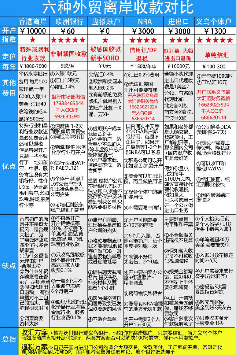 ⑤香港离岸定位特殊行业和暴利行业收款,比如珠宝和饰品等,小客户不容易开户,缺点是一直以来风控太差,导致现在要大批销户,开户门槛和运营成本太高。
