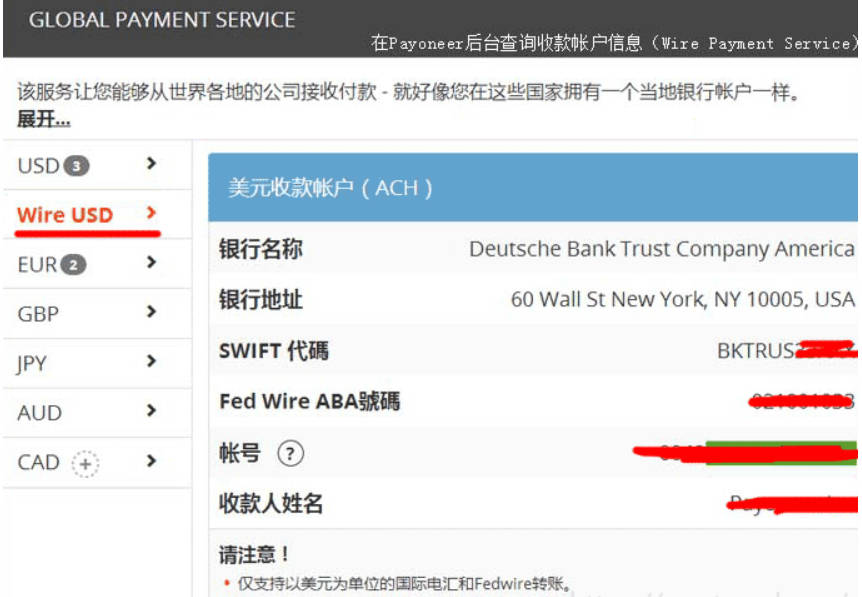 所以 Payoneer 又提供了 Wire Payment Service(离岸账户收款业务),其实就相当于一达通跟花旗银行合作的离岸虚拟子账户一样。由德意志银行美国信托公司(Deutsche Bank Trust Company America)签发,再提现到国内/香港银行时Payoneer收取0.5%封顶的费用