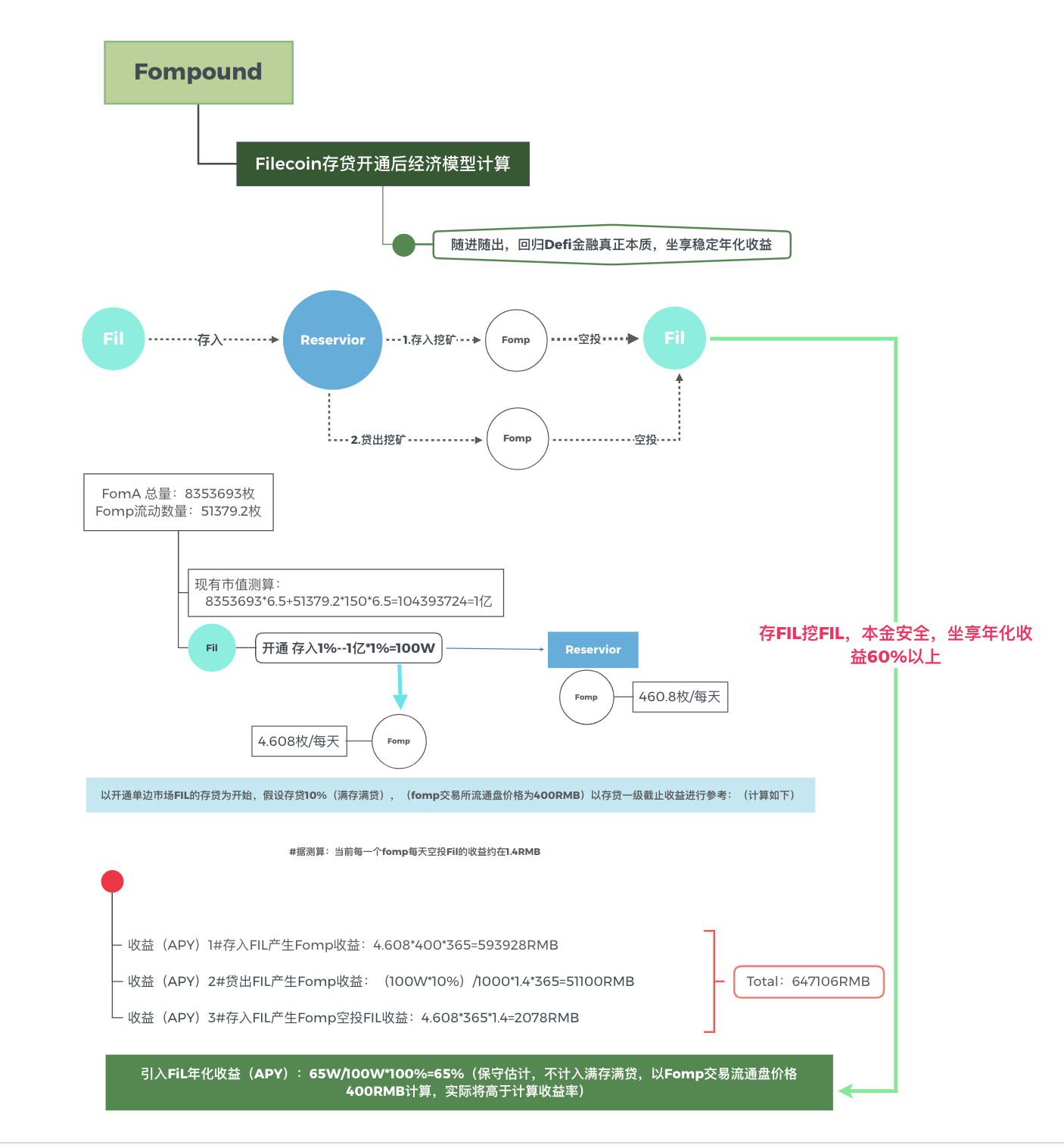 Fompound的技术核心是存贷生息,附加分配Fomp平台币,基础原理可以划分为:存贷利率模型、清算机制、Fomp分配机制、管理员审查机制、区块链实体挖矿收益机制。Fompound平台开通FIL的存贷功能,既符合Fompound平台本身的调性和发展方向,也能让Fomp的用户同时FIL的持有者获得更多的一份收益——收FIL利息。