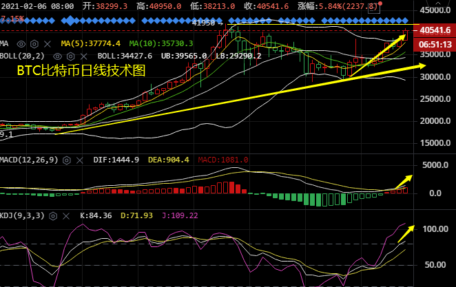 日线连涨,再度稳固了多头情绪,特别是突破40000美元关口之后,但谈老师认为这并不是我们的终极目标,上方仍有上涨空间,按照这种势头走下去破新高或看向45000美元也是很有可能的,毕竟日线的MACD还没有到超买的状态。短线的话比特币沿着MA5/MA10均线持续性走高,上行空间亦是随着行情的上涨而延伸,目前短线需关注BOLL上轨于41000美元一带阻力,下方则需关注40000美元关口支阻力转换的支撑,其次就是BOLL中轨于39400美元一带支撑。短周期KDJ技术指标缓和运行,附图MACD动能缩量,预计比特币将保持高位调整。假若出现调整或回调不要惊慌,毕竟大趋势偏多,交易上我们仍可保持低多思路进行。若对技术行情以及消息面解读把握不定或者持有套单的朋友皆可与谈老师进行探讨。订阅公众号;币圈散户联盟。