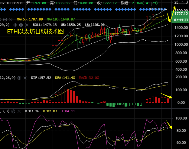 日线上看比特币在大涨收十字星之后,今日收阴出现回落,BOLL呈开口状态,币价交投于BOLL上轨附近,短期均线MA5/MA10交金叉分别于43200、40000美元一带给予支撑,上方则需关注日内高位于47200美元一带阻力。短周期KDJ技术指标缓和向下,附图MACD上行动能放量,预计比特币将保持高位调整。四小时上看比特币在冲破48000美元关口之后多头放缓,在一波横盘之后,一根大阴线直接向下跌破两大均线,均线MA5/MA10交死叉分别于46000、45600美元一带形成压制,而下方则重点关注BOLL中轨于43600美元一带支撑,一旦下破的话币价将继续下探。短周期KDJ技术指标缓和向下,附图MACD下行动能放量,预计比特币短线伴有回调的迹象。